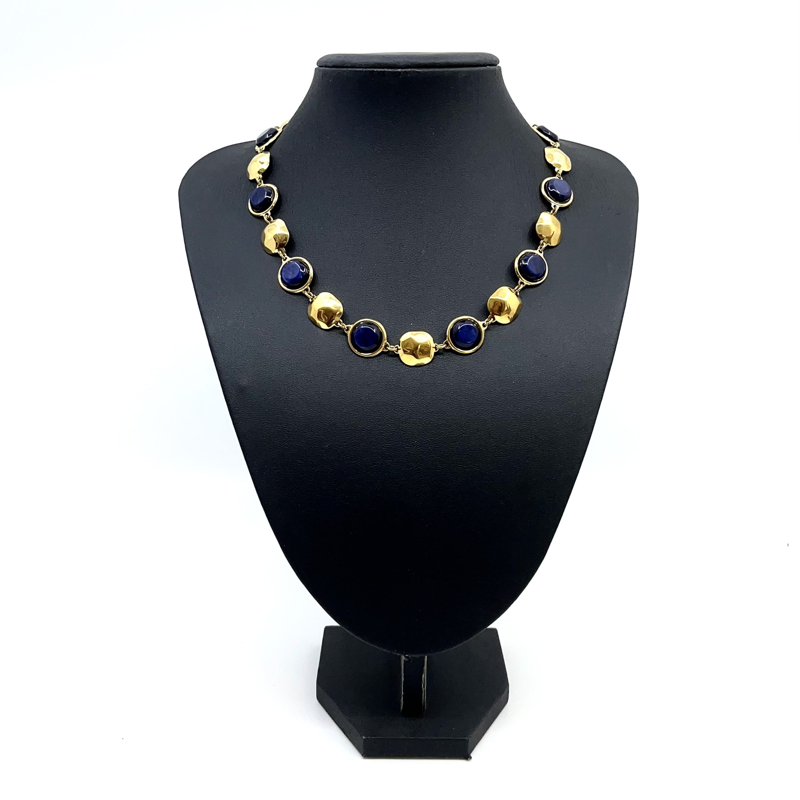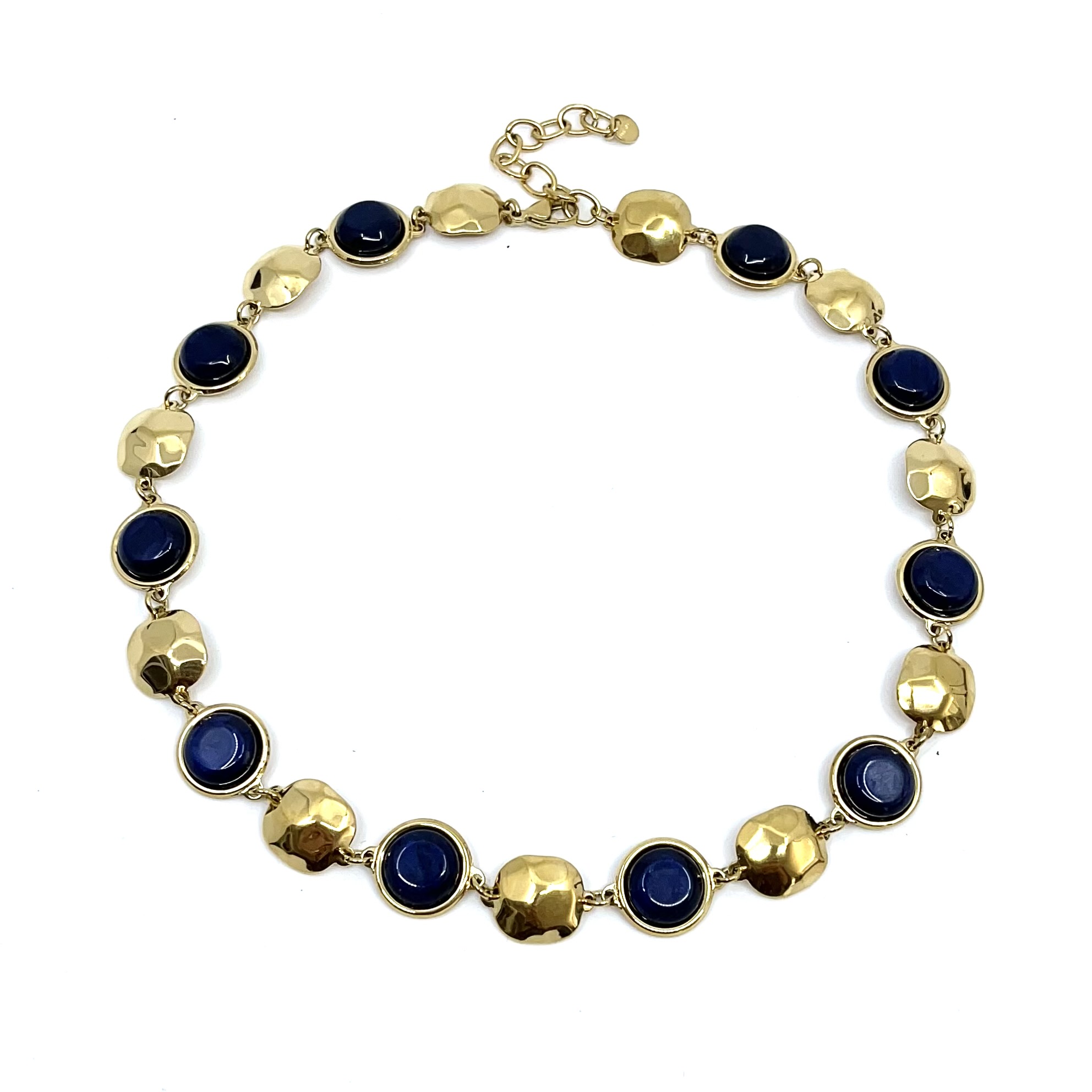 Κολιέ με μπλε πέτρες από ανοξείδωτο ατσάλι 316L σε χρώμα χρυσό. Τα τετραγωνισμένα ατσάλινα στοιχεία συνδυασμένα με τις κυκλικές μπλε πέτρες δημιουργούν ένα ιδιαίτερο γεωμετρικό αποτέλεσμα που εντυπωσιάζει. Ένα κόσμημα που μπορεί να υποστηρίξει μια επίσημη εμφάνιση και ένα κλασικό σύνολο!