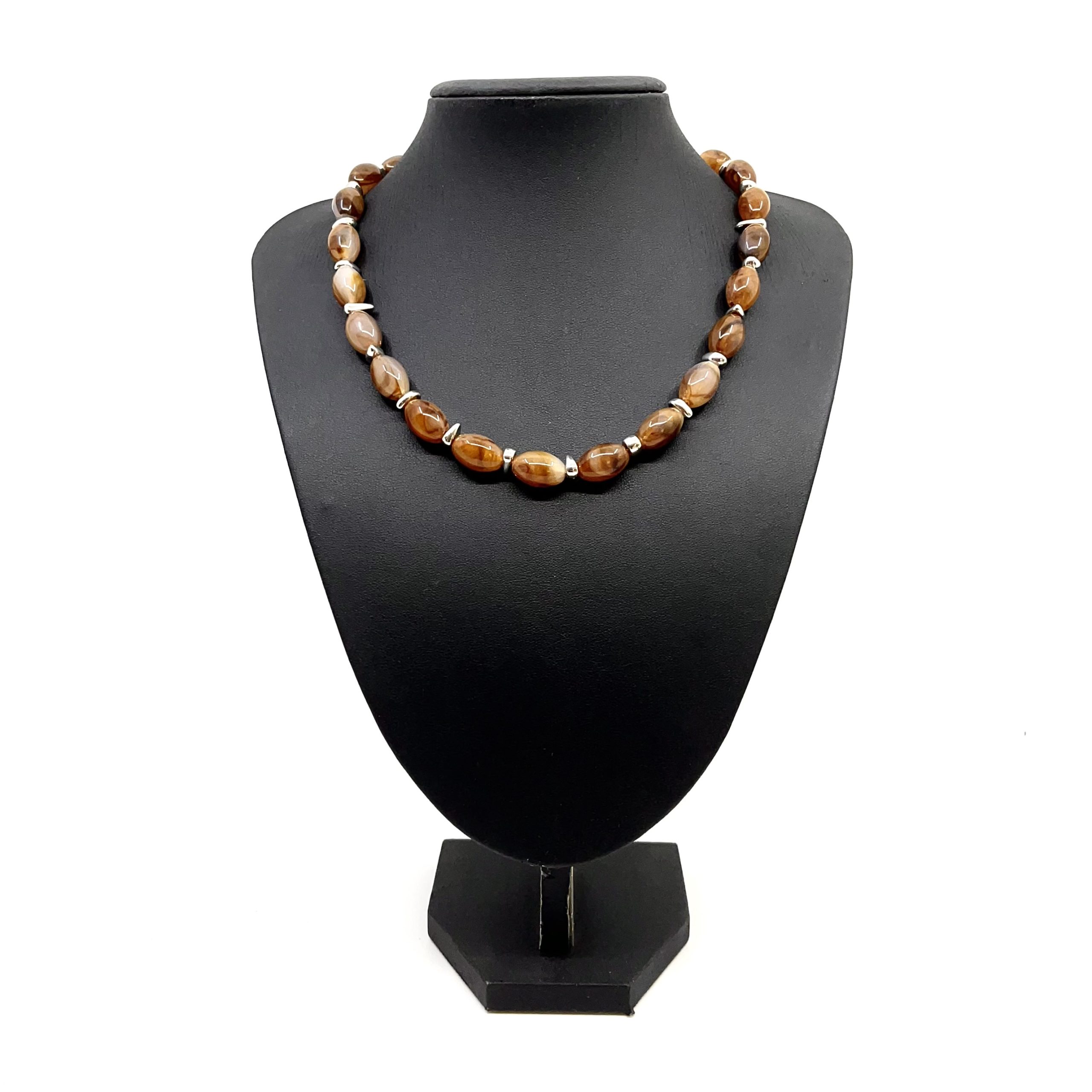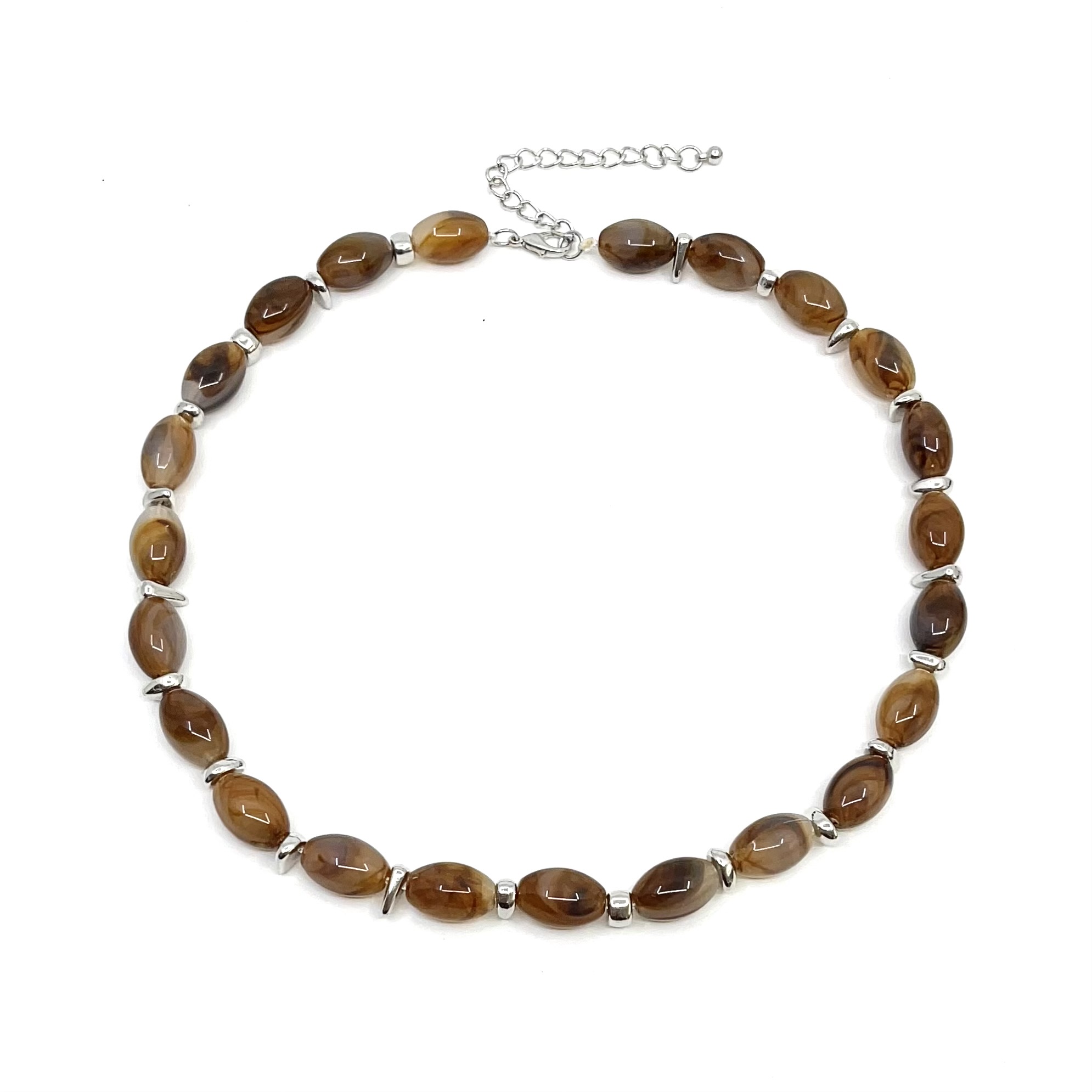 Κοντό κολιέ με καφέ χάντρες και ασημί λεπτομέρειες. Κόσμημα που συνοδεύει τέλεια τα outfit με γήινες αποχρώσεις!!