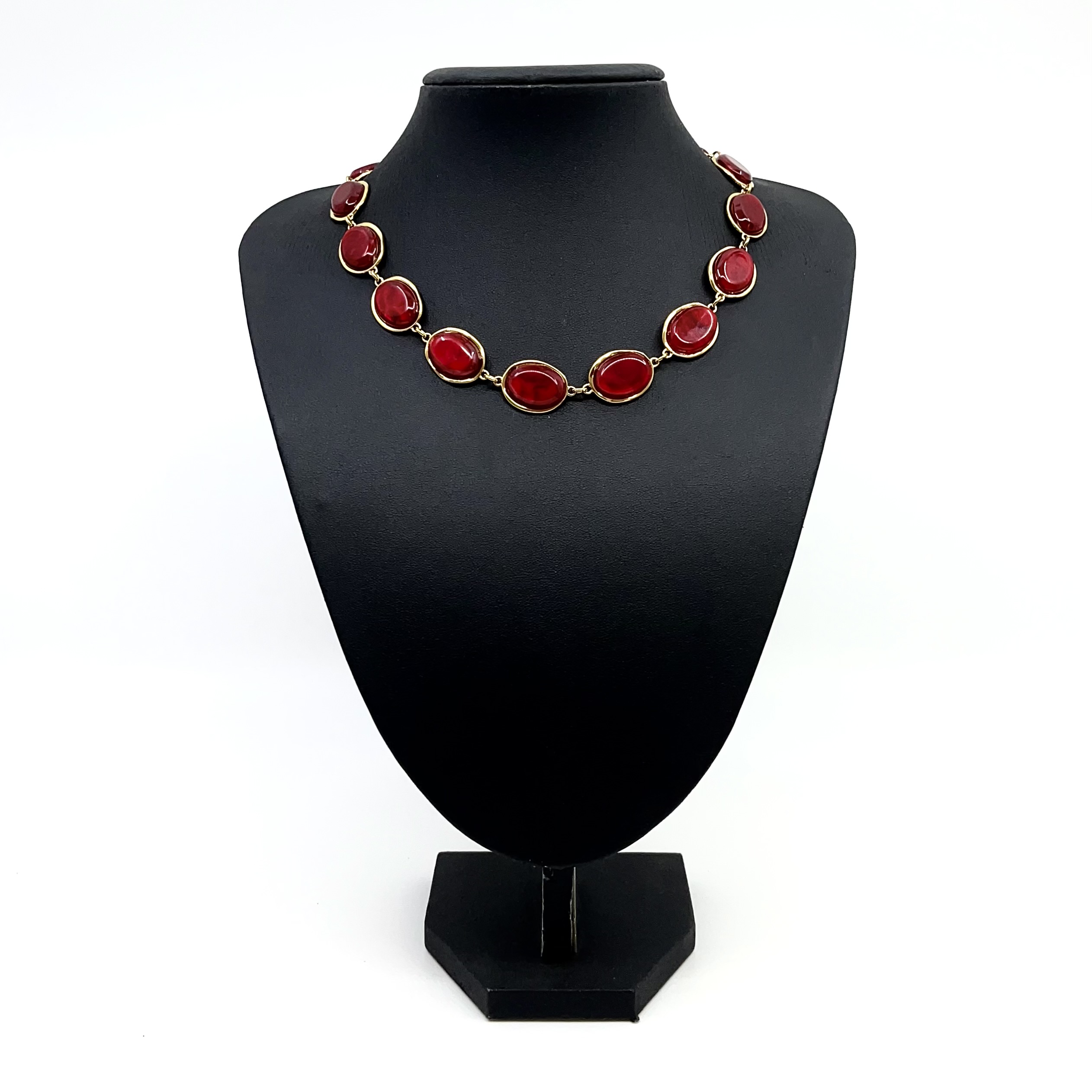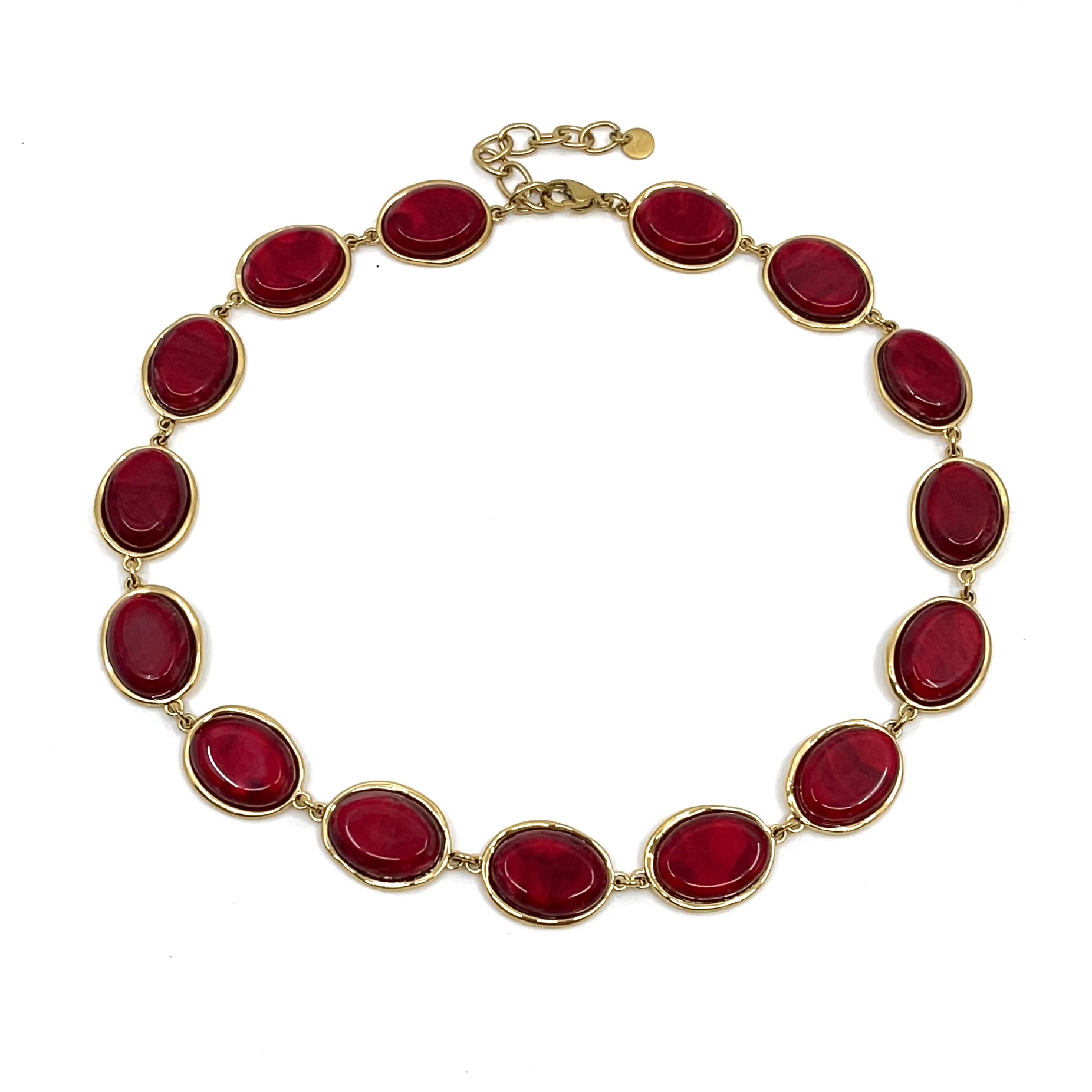 Κοντό κολιέ από ανοξείδωτο ατσάλι 316L σε χρώμα χρυσό με μεγάλες κόκκινες πέτρες σε οβάλ σχήμα. Ένα εντυπωσιακό κόσμημα που μπορεί να υποστηρίξει μια επίσημη εμφάνιση. Φόρεσέ το με total black σύνολο και πρόσθεσε άλλο ένα αξεσουάρ σε κόκκινο χρώμα, όπως μια τσάντα ή ένα δαχτυλίδι. Και η επιτυχία είναι σίγουρη!!