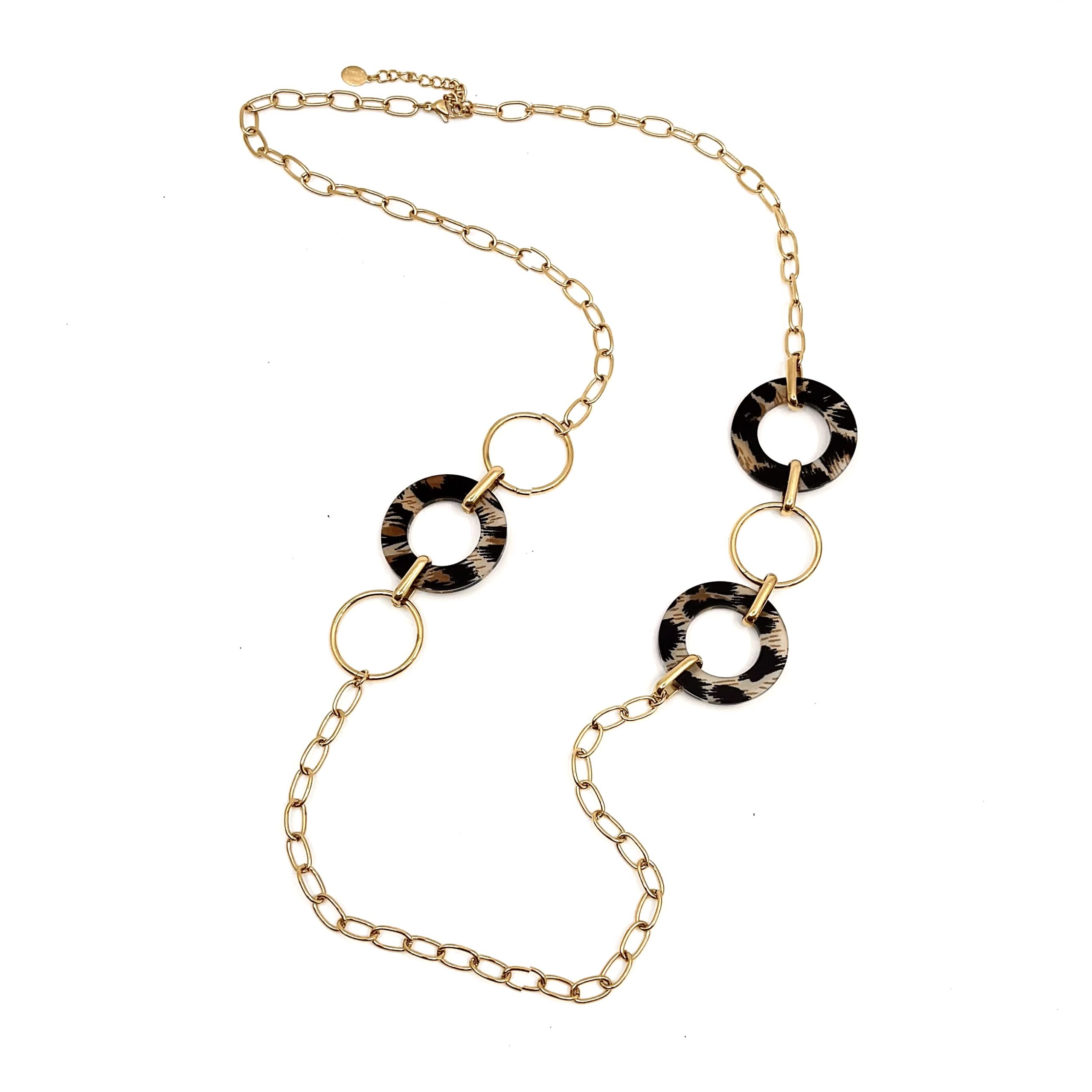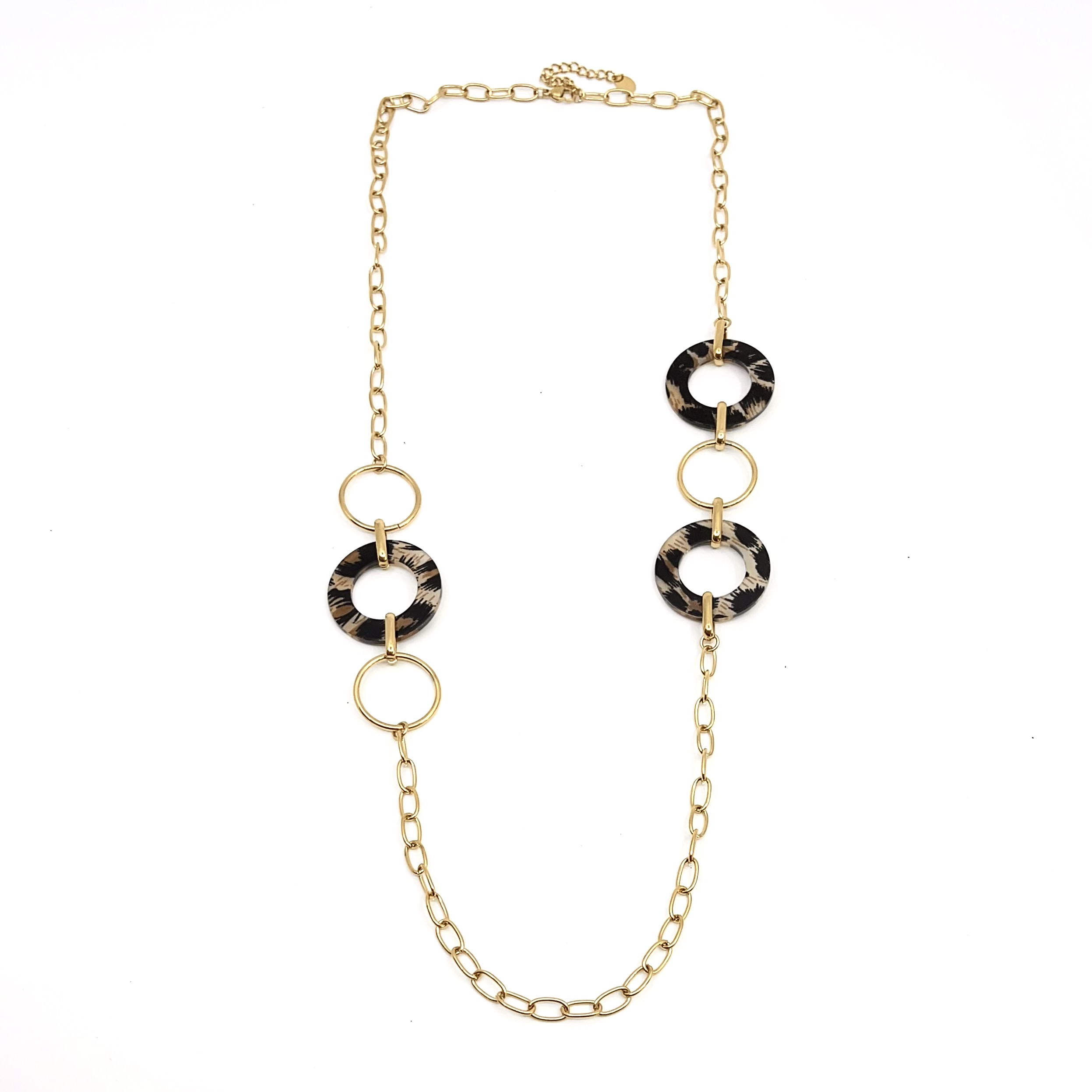 Μακρύ κολιέ με animal print. Η αλυσίδα από ανοξείδωτο ατσάλι σε χρώμα χρυσό και οι plexiglass κρίκοι σε animal print δημιουργούν ένα ιδιαίτερο αποτέλεσμα. Φόρεσέ το κάθε μέρα και παντού με την εγγύηση Dorian Gray!!
